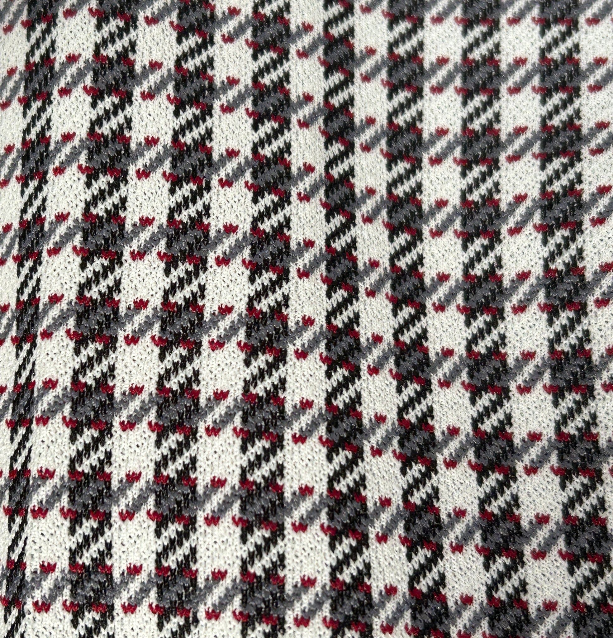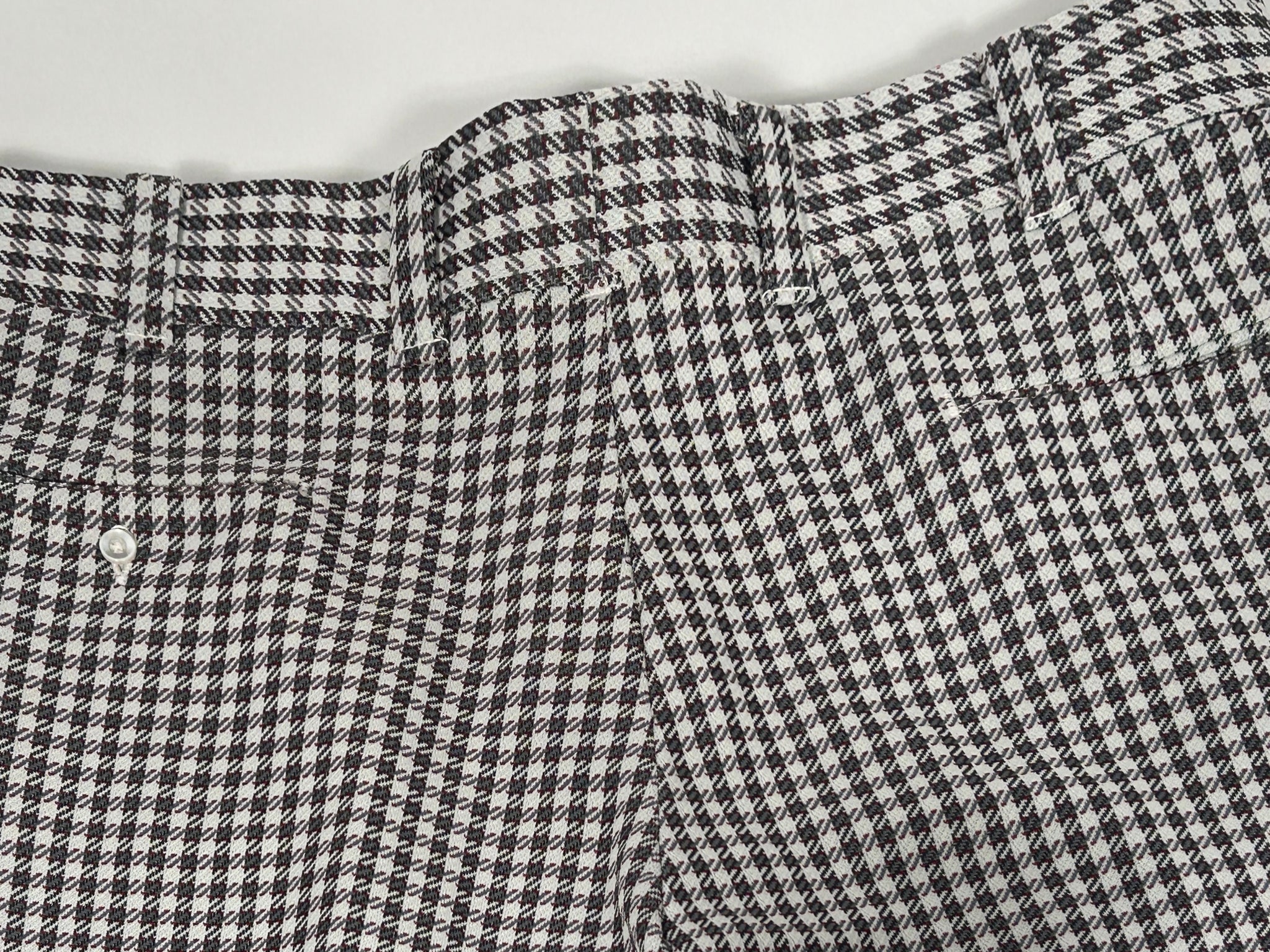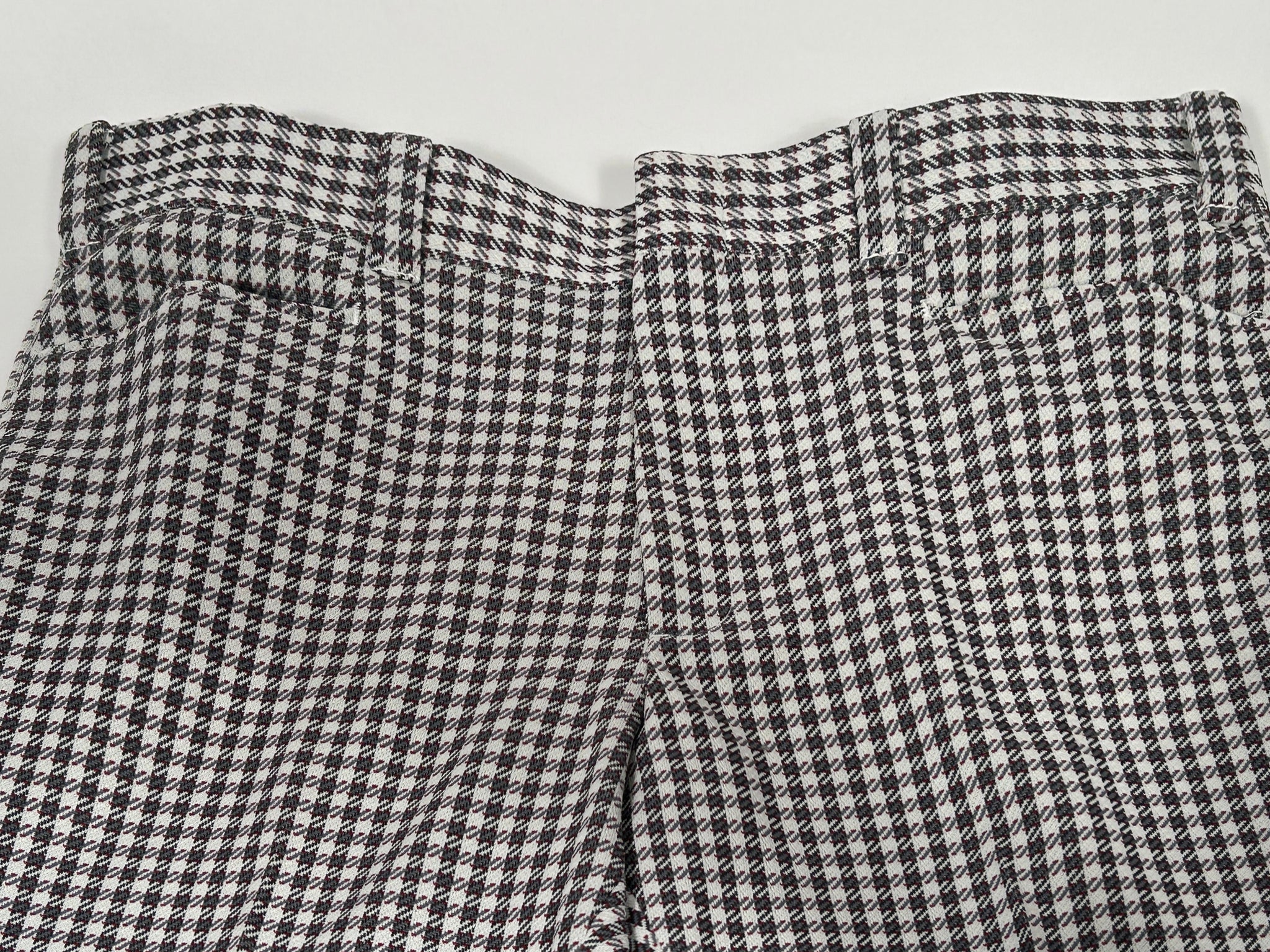 Early 70s Panatella pant in great herringbone checked grey and red pattern. Belted loops at waist with 2 front pockets and 2 back pockets, 1 with button closure.
