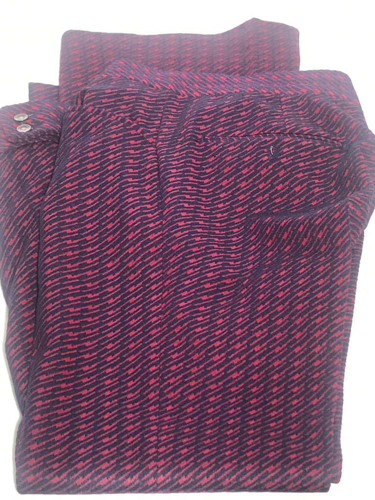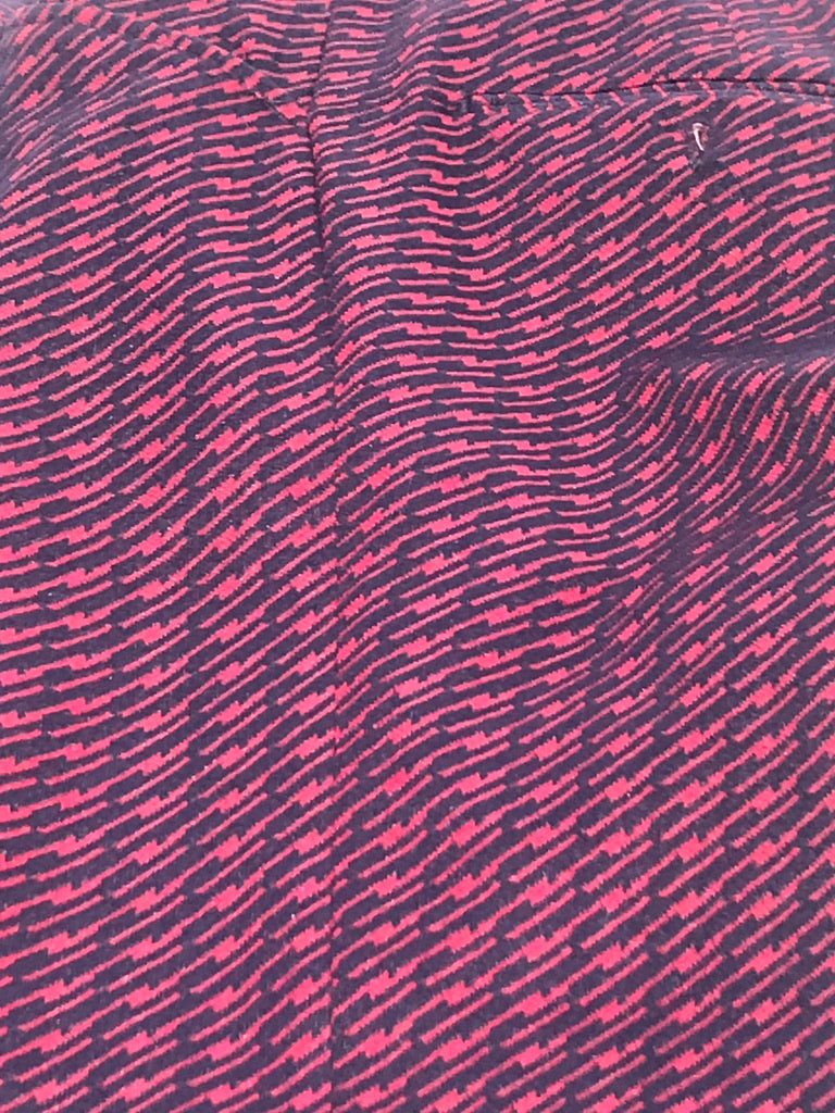 SHOUT out to Bills Mafia on these blue and red poly knit pants with slight flare opening at 10" at hem. Metal zipper with button belt over - no loops for belt.