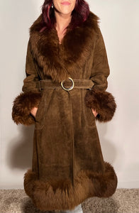 1970s Brown Leather Suede Faux Fur Trim Cuff Collar & Hem Womens Sm 37" Bust
