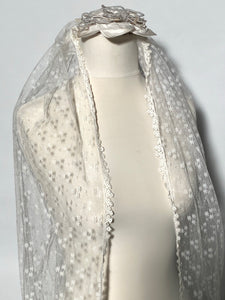 Vintage Pearl Beaded Veil Topper & Long 92" Embroidered Lace Train