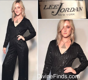 1970s Black Sequin Belted Bell Bottom Jumpsuit By Lee Jordan