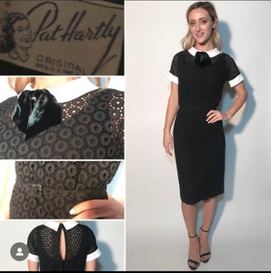 Pat Hartly 1950s Belted Peter Pan Collar Eyelet Dress Velvet Bow Front