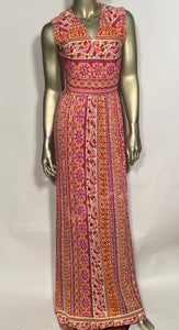 1970s Patterned Floral Pink Yellow and Melon Colored Maxi Dress